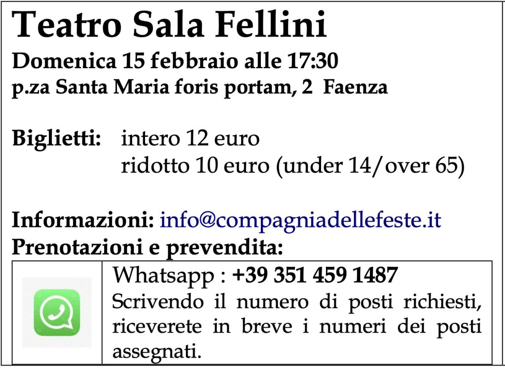 Invia un messaggio whatsapp al numero del Teatro Sala Fellini con scritto “INGANNO” e il numero di posti con preferenza.